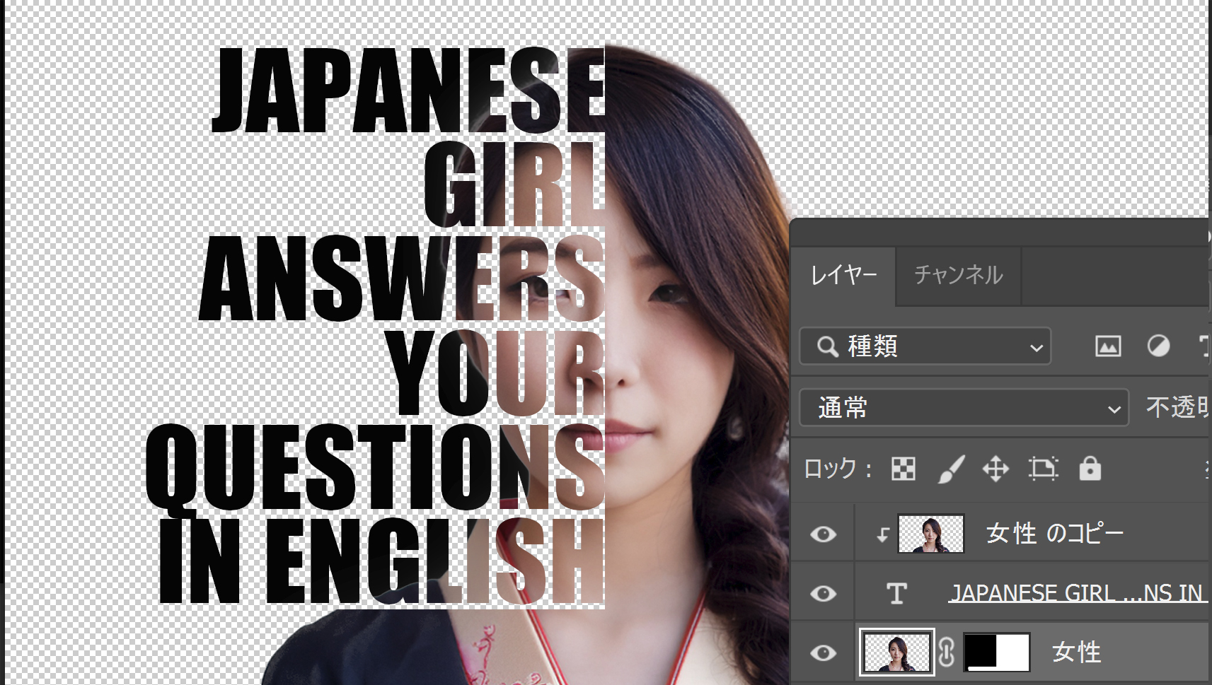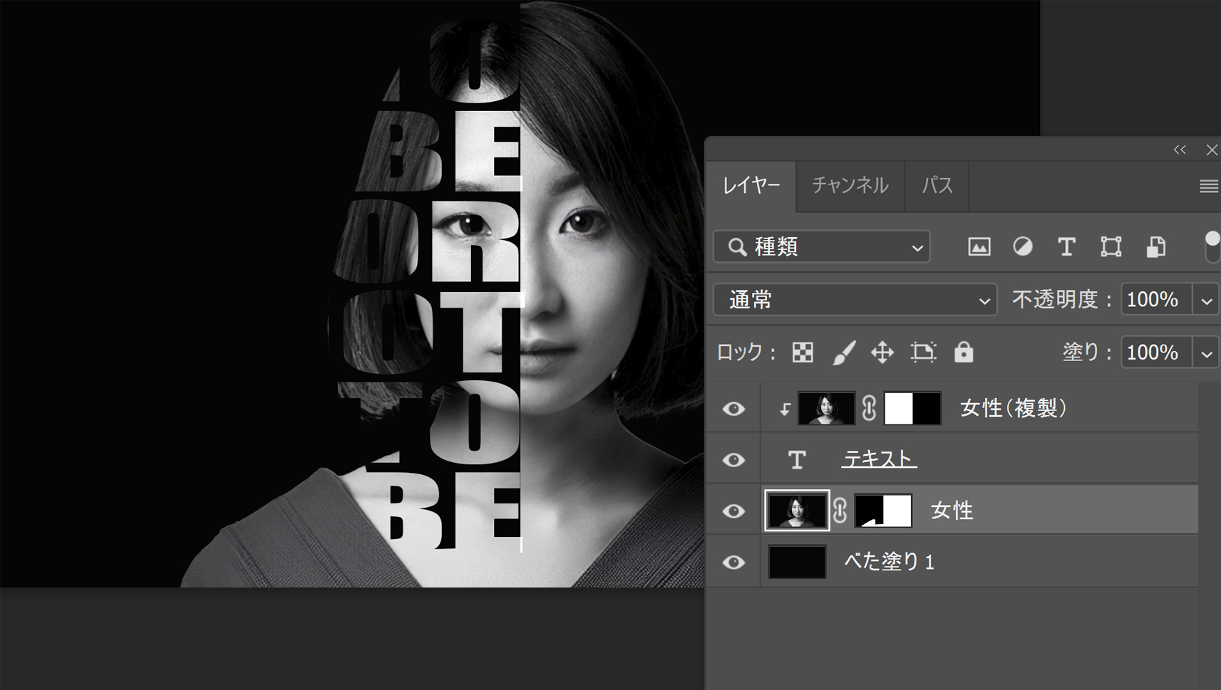 テキスト肖像画の作成方法 https://print-print.net/wp-content/uploads/2025/05/顔半分に文字.mp4 photoshopで対象の写真(背景なし)を開く→ 新規レイヤーを作成しベタ塗り(下層へ)→ 新規レイヤーを作成し半分を塗りつぶす(上層へ)→ さらに新規レイヤーに使用したい文字を入力(上層へ)→ 文字レイヤーのサムネールをCtrl+クリックし選択→ ※レイヤー上にある描画部分が自動的に選択範囲として点線で囲われて表示される 文字レイヤーを非表示にし、半分を塗りつぶしたレイヤーで選択範囲を削除 覆い焼きツールで暗い部分をなぞって明るくする 加工例 2025年5月14日 投稿先 adobe系ソフトの事 ← 過去の投稿へ 次の投稿へ → コメントを残す コメントをキャンセルメールアドレスが公開されることはありません。 ※ が付いている欄は必須項目ですコメント ※ 名前 ※ メール ※ サイト